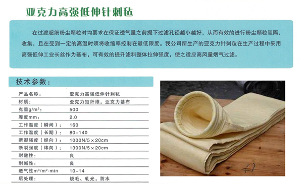 亞克力針刺氈化學名均聚丙烯腈,用它為原料經針刺法制成氈,然后經過特殊的拒水處理從而得到亞克力中溫抗水解針刺過濾氈。透氣量14m3/m2·min,瞬間工作溫度160℃,正常工作140℃。針刺氈以亞克力機織布為基布增強縱橫強力。亞克力針刺氈除塵布袋具有優良的耐化學性和抗水解性,廣泛應用于垃圾焚燒、瀝青、噴舞干燥器、煤磨、電廠等煙氣的收塵。